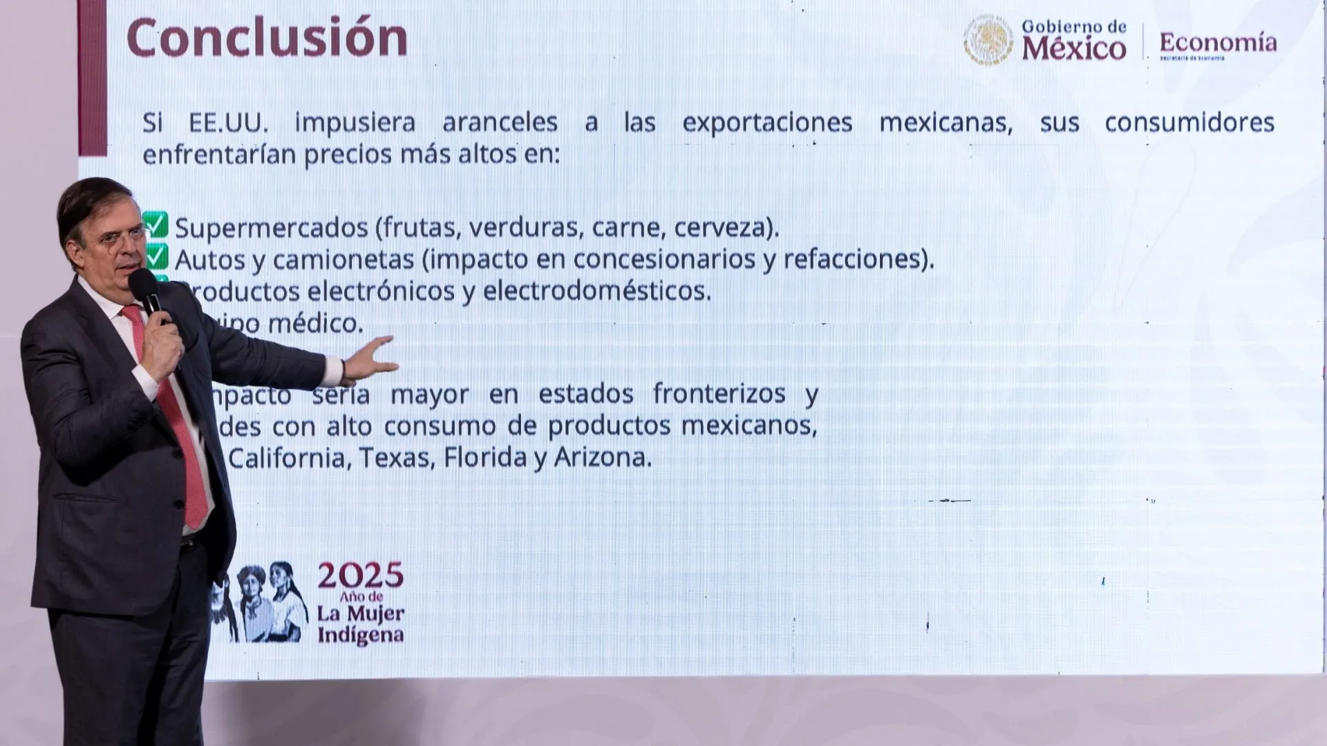 «Esto es lo que estimamos el impacto de un día al otro, para que tengamos una percepción de por qué es un error estratégico una tarifa (arancel) de 25%. Conviene tenerlo claro. El principal impacto (será que) millones de familias en Estados Unidos tendrán que pagar 25% más», señaló.