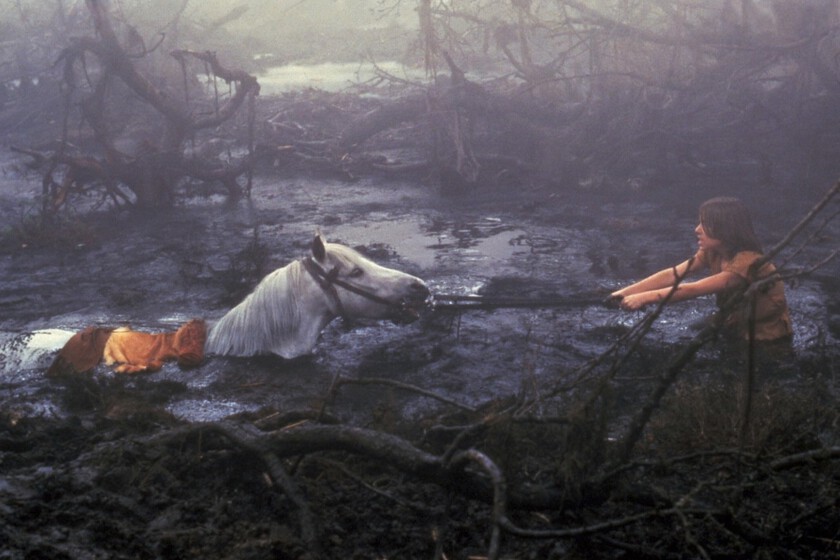No por ello fue menos desagradable la realización de la escena, en la que estuvieron horas sumergidos en un plató lleno de barro. Tras acostumbrar al animal a estar en terreno pantanoso, lo colocaron encima de una plataforma móvil que se iba hundiendo.